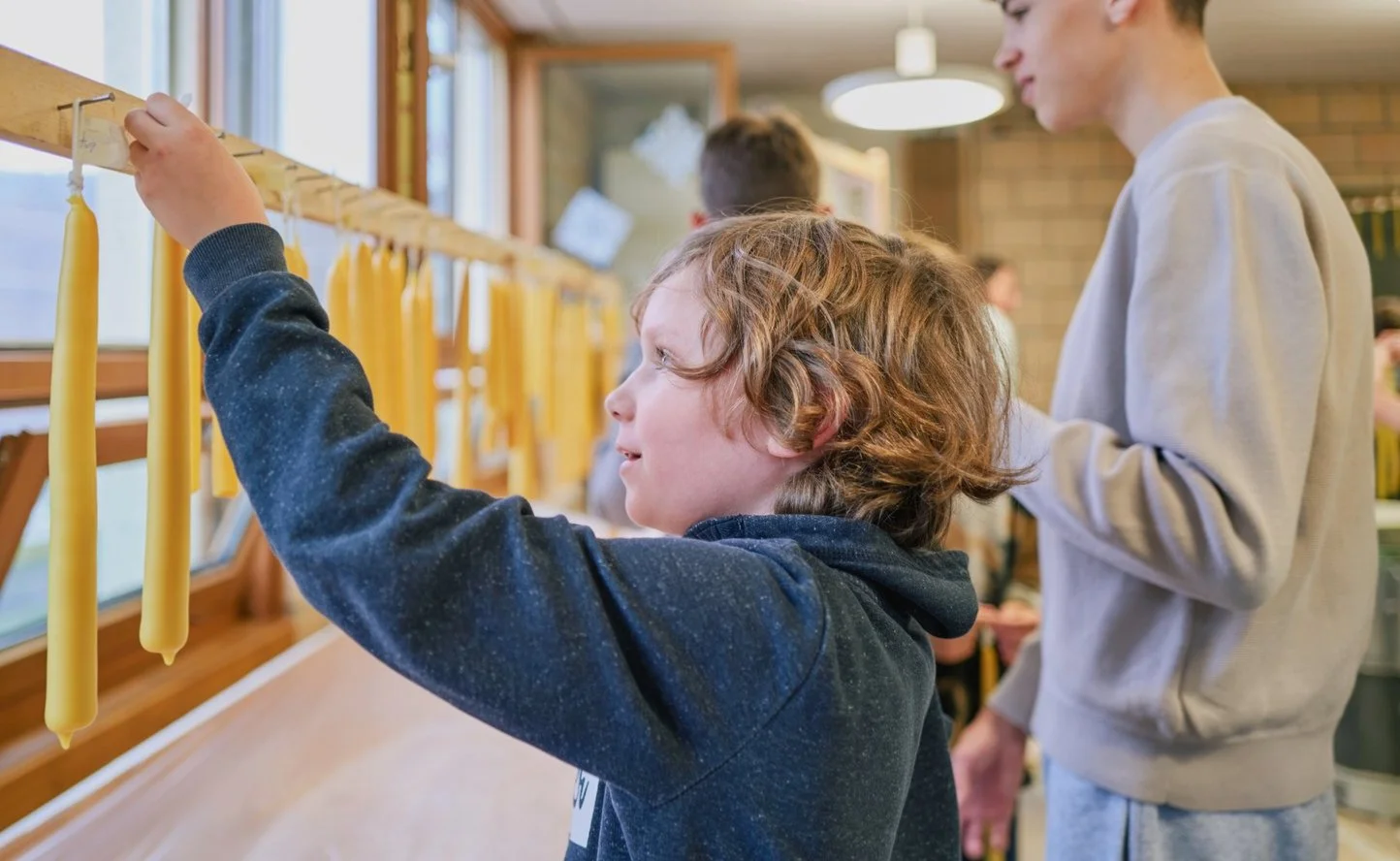 Beim Kerzenziehen entstanden kleine Lichtträger aus Bienenwachs, die von Kindern und Erwachsenen gemeinsam gestaltet wurden. Schicht für Schicht wuchs die Kerze heran – ein stilles Tun, das Geduld, Achtsamkeit und Ausdauer fördert. Das wunderbar duftende Bienenwachs begleitete die Tätigkeit, und die fertigen Kerzen begleiteten viele Familien durch die dunkle Jahreszeit, strahlten Licht und Wärme in den Alltag und erinnerten an die besondere Atmosphäre der Weihnachtszeit.