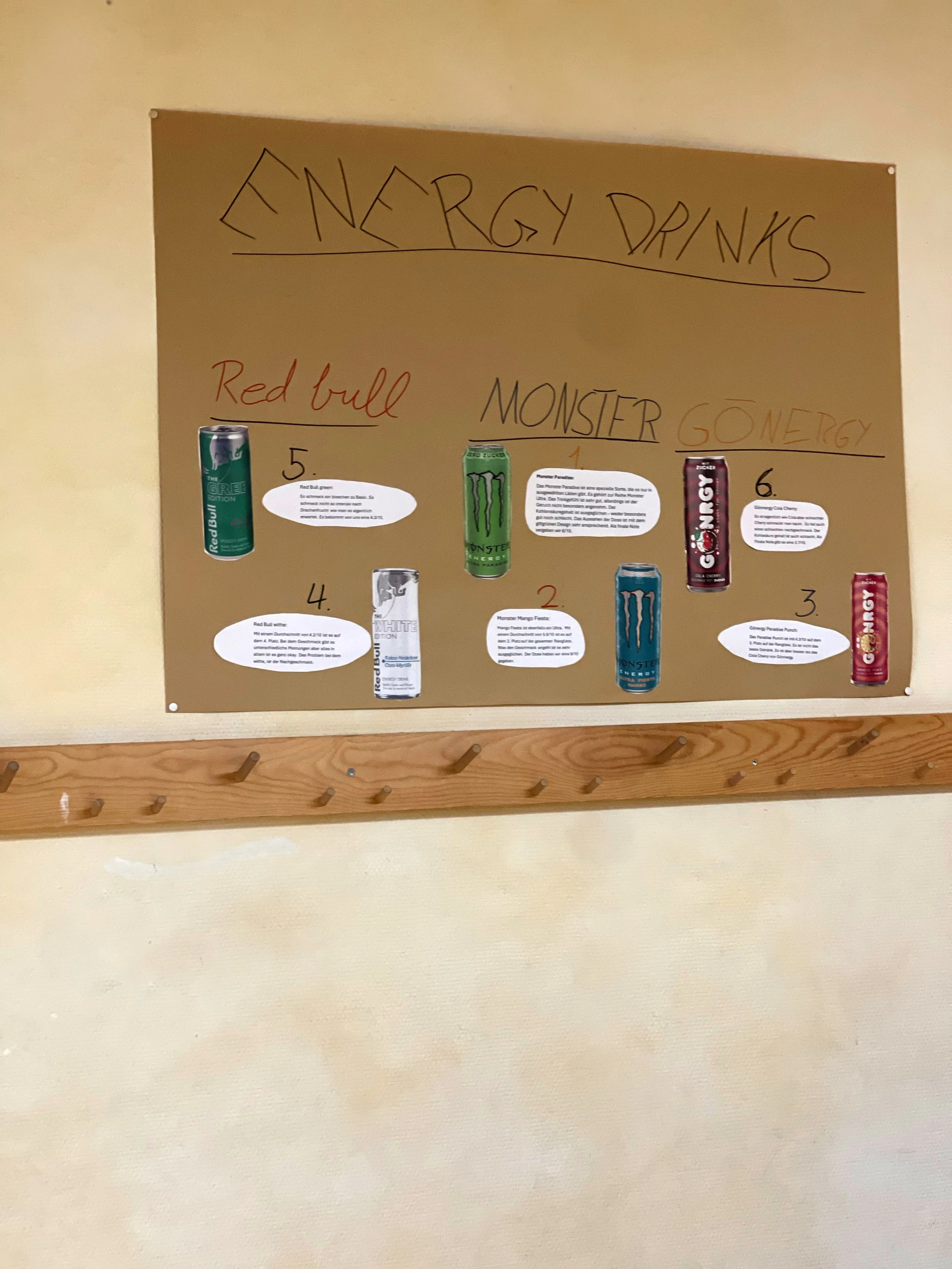 Im Rahmen eines Unterrichtsprojekts untersuchte die 9. Klasse der Oberstufe einer Steiner Schule verschiedene Lebensmittel derselben Produktgruppen. Ziel war es, Unterschiede im Preis, in den Inhaltsstoffen sowie im Geschmackherauszuarbeiten und miteinander zu vergleichen. Untersucht wurden unterschiedliche Energy Drinks, Chipssorten, Gummibärchen und Orangensäfte. Zu jedem Lebensmittel gestalteten die Schülerinnen und Schüler eigene Plakate, auf denen die Ergebnisse anschaulich dargestellt wurden.